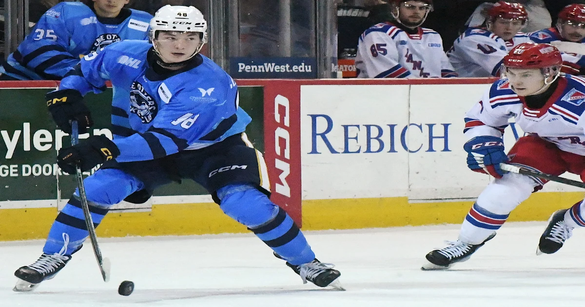 Erie Otters defenseman Matthew Schaefer, right, controls the puck against the Kitchener Rangers at Erie Insurance Arena in Erie on Nov. 23, 2024.