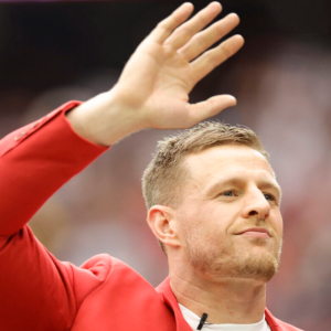HOUSTON, TEXAS – OCTOBER 01: Former Houston Texans player J.J. Watt waves to the crowd during a ceremony inducting him into the Texans Ring of Honor during a game against…