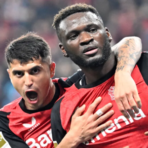 Nur noch drei Punkte Rückstand Druck nimmt zu: Leverkusen jagt Bayern Aktualisiert am 28.03.2025 – 22:36 Uhr Lesedauer: 2 Min. Victor Boniface (r.): Leverkusens Torjäger lässt sich von Exequiel Palacios…