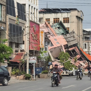People ride motorcycles past a damaged building after a strong earthquake struck central Myanmar, in Mandalay, Myanmar, March 28, 2025. REUTERS/Stringer Purchase Licensing Rights , opens new tab March 28…