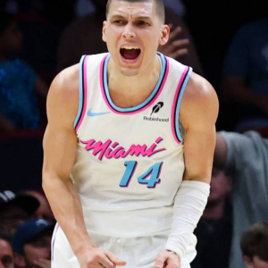 Miami Heat guard Tyler Herro (14) screams after the heat score a three pointer during the second half of a game on Thursday, March 27, 2025, at the Kaseya Center…