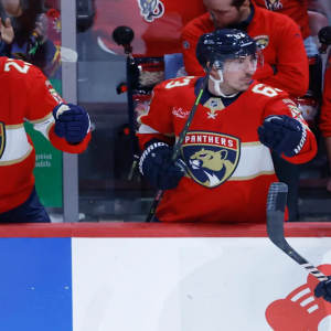 1 / 9 Florida Panthers center Sam Bennett (9) celebrates after his goal with center Carter Verhaeghe (23) and center Brad Marchand (63) during the second period of an NHL…