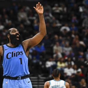 Mar 16, 2025; Inglewood, California, USA; LA Clippers guard James Harden (1) reacts against the Charlotte Hornets during the second half at Intuit Dome. Mandatory Credit: Jonathan Hui-Imagn Images /…