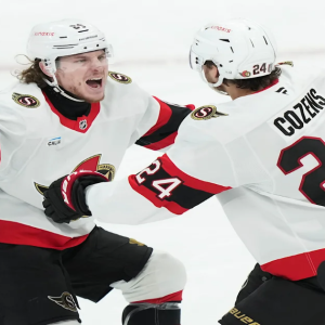 1 / 7 Ottawa Senators’ Dylan Cozens (24) celebrates his short handed goal with teammate Adam Gaudette (81) during third period NHL playoff action in Toronto on Tuesday, April 29,…