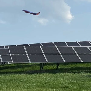A SOUTHWEST PLANE FLIES OVER THE 10,000 SOLAR PANELS AT PITTSBURGH INTERNATIONAL AIRPORT. THE SOLAR FIELD WILL MORE THAN DOUBLE IN SIZE BY 2027. | PHOTO BY VIRGINIA LINN When…
