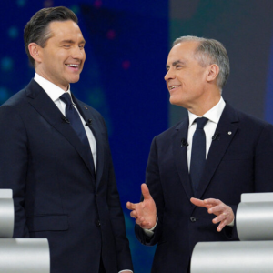 (L-R) Canadian Prime Minister and Liberal leader Mark Carney (L) speaking during a campaign rally in London, Ontario, on April 25, 2025 and Canadian Conservative Leader Pierre Poilievre speaking during…