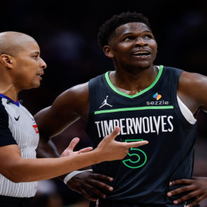 Apr 1, 2025; Denver, Colorado, USA; Minnesota Timberwolves guard Anthony Edwards (5) talks with referee CJ Washington (12) in overtime against the Denver Nuggets at Ball Arena. Mandatory Credit: Isaiah…