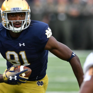Sep 8, 2018; South Bend, IN, USA; Notre Dame Fighting Irish wide receiver Miles Boykin (81) carries in the third quarter against the Ball State Cardinals at Notre Dame Stadium….