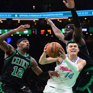 Miami Heat guard Tyler Herro (14) drives to the basket between Boston Celtics forward Torrey Craig (12) and center Neemias Queta (88) during the first half at TD Garden. Bob…