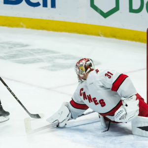 Apr 17, 2025; Ottawa, Ontario, CAN; Ottawa Senators center Tim Stutzle (18) scores against the Carolina Hurricanes goalie Frederik Andersen (31) in the third period at the Canadian Tire Centre….