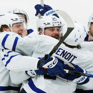 Toronto Maple Leafs’ Matthew Knies (23) celebrates after the winning goal with teammates Simon Benoit (2), Auston Matthews (34) and Oliver Ekman-Larsson (95) during overtime against the Ottawa Senators in…