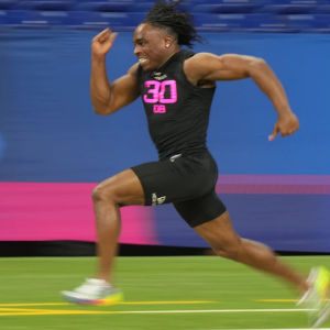 Feb 28, 2025; Indianapolis, IN, USA; Western Kentucky defensive back Upton Stout (DB30) runs in the 40 yard dash during the 2025 NFL Combine at Lucas Oil Stadium. Mandatory Credit:…
