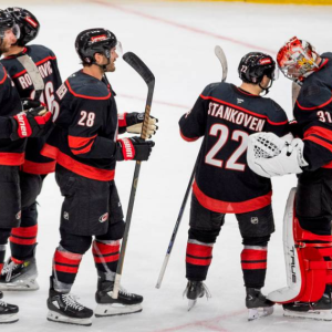 Carolina Hurricanes center Logan Stankoven (22) congratulates goalie Frederik Andersen (31) following their 4-1 victory over the New Jersey Devils on Sunday, April 20, 2025 at Lenovo Center in Raleigh,…