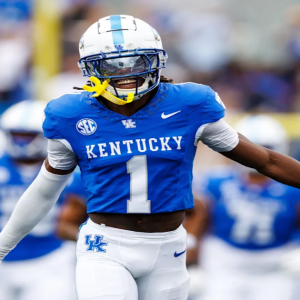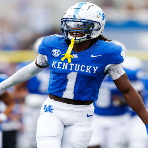 Sep 21, 2024; Lexington, Kentucky, USA; Kentucky Wildcats defensive back Maxwell Hairston (1) runs onto the field before the game against the Ohio Bobcats at Kroger Field. Mandatory Credit: Jordan…