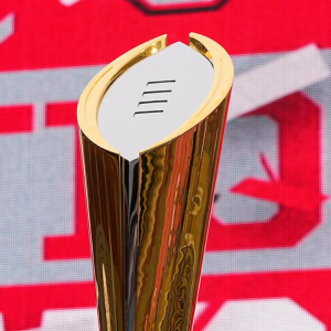 The College Football Playoff trophy sits on display during the Ohio State Buckeyes National Championship celebration at Ohio Stadium in Columbus on Jan. 27, 2025. / Adam Cairns/Columbus Dispatch /…