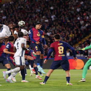 BARCELONA, SPAIN – APRIL 30: Denzel Dumfries of FC Internazionale scores his team’s third goal during the UEFA Champions League 2024/25 Semi Final First Leg match between FC Barcelona and…