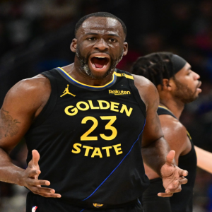 Apr 20, 2025; Houston, Texas, USA; Golden State Warriors forward Draymond Green (23) reacts after a call during the fourth quarter against the Houston Rockets at Toyota Center. Mandatory Credit:…