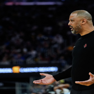 Houston Rockets head coach Ime Udoka reacts during the first half of an NBA basketball game against the Golden State Warriors, Sunday, April 6, 2025, in San Francisco. Godofredo A….