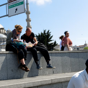 Item 1 of 2 People sit in Eminonu district, as the New Mosque is seen in the background, following an earthquake, in Istanbul, Turkey, April 23, 2025. REUTERS/Murad Sezer [1/2]People…