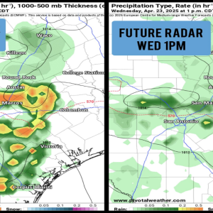 Shown is the potential future radar at 10 p.m. Tuesday (left), as well as 1 p.m. Wednesday (right), according to the ECMWF weather model. Pivotal Weather Much of South Texas…