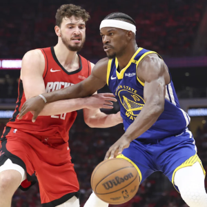 Apr 20, 2025; Houston, Texas, USA; Golden State Warriors forward Jimmy Butler III (10) controls the ball as Houston Rockets center Alperen Sengun (28) defends during the second quarter at…