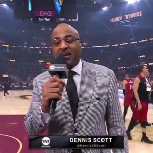 Courtside reporter Dennis Scott fills in for Spero Dedes on NBA on TNT play-by-play during technical issues