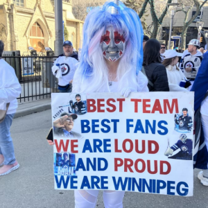WINNIPEG – Sheila Hathaway was bedecked in her Winnipeg Jets Whiteout best, including a white-and-blue wig with the Stanley Cup affixed to the top and face makeup of the team’s…