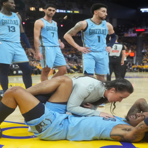 1 / 2 Memphis Grizzlies guard Ja Morant, bottom, reacts after hitting the floor during the second half of an NBA play-in tournament basketball game against the Golden State Warriors…