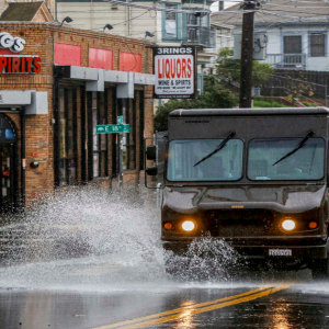 A UPS delivery truck drives through a puddle in Oakland. The company announced on Tuesday that it will eliminate 20,000 jobs and close 73 facilities by June, citing economic uncertainty…