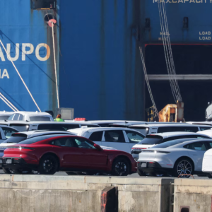 Item 1 of 2 A Volkswagen Group car is loaded into a cargo ship as Porsche luxury and other VW cars intended for the export to the United States wait…
