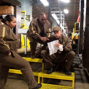 UPS drivers wait as their trucks are loaded at a Manhattan UPS facility in New York. United Parcel Service‘s first-quarter profit beat market estimates and the parcel delivery giant said…