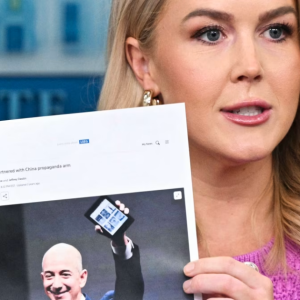 White House press secretary Karoline Leavitt holds a news article on Amazon CEO Jeff Bezos. (Mandel Ngan/Agence France-Presse/Getty Images) “This is a hostile and political act by Amazon,” White House…