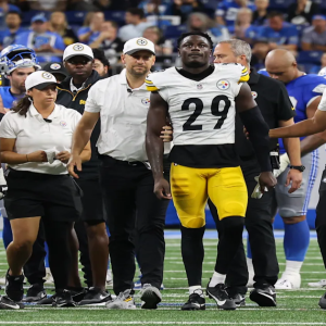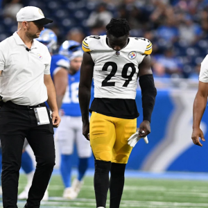 Aug 24, 2024; Detroit, Michigan, USA; Pittsburgh Steelers cornerback Ryan Watts (29) walks off the field after being injured against the Detroit Lions late in the fourth quarter at Ford…
