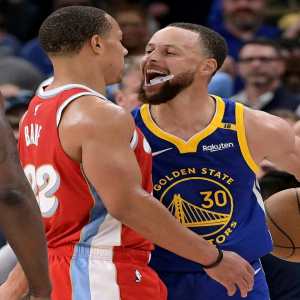 Golden State Warriors guard Stephen Curry (30) antagonizes Memphis Grizzlies guard Desmond Bane (22) in the second half of an NBA basketball game Tuesday, April 1, 2025, in Memphis, Tenn….