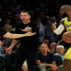 Lakers head coach JJ Redick and Los Angeles Lakers forward LeBron James (23) confront referee Tyler Ford (39) after Los Angeles Lakers guard Luka Doncic was called for a technical foul…