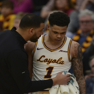 Loyola coach Drew Valentine talks with Jayden Dawson during a game against Dayton, Friday, March 1, 2024, in Chicago. INDIANAPOLIS — Trey Bonham scored 23 points and Honor Huff hit…