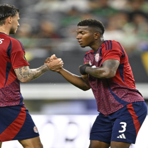 Jun 18, 2025; Arlington, Texas, USA; Costa Rica defender Jeyland Mitchell (3) and defender Juan Pablo Vargas (4) celebrate post game against the Dominican Republic during a group stage match…