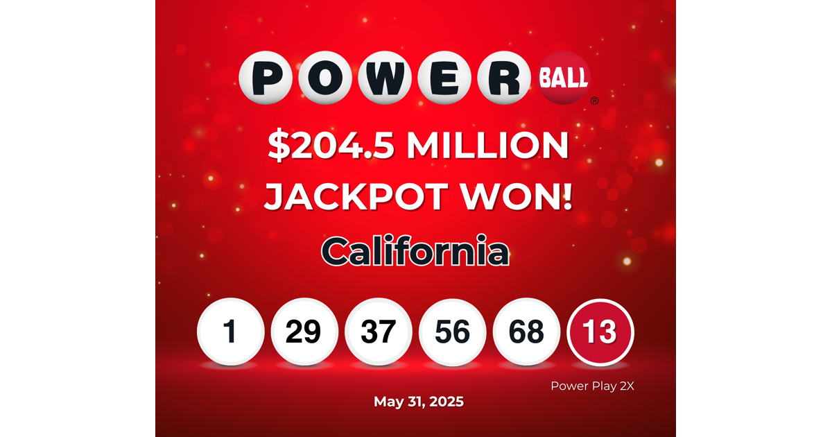 The Powerball® jackpot has been won in California! A single ticket in California matched all six numbers drawn Saturday night – white balls 1, 29, 37, 56, 68 and red Powerball 13 – to win a jackpot worth $204.5 million. The jackpot has a cash value of $91.6 million.