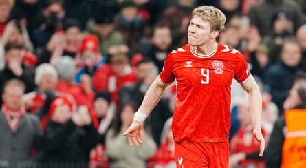 Rasmus Højlund celebrates his winner against Portugal for Denmark, and now has two goals in two games for club and country after a barren spell. Photograph: Liselotte Sabroe/AP