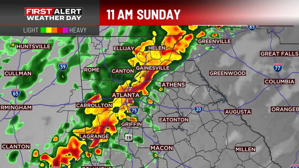 Storms move into metro and downtown Atlanta between 11 AM – 1 PM. Isolated severe storms still possible.