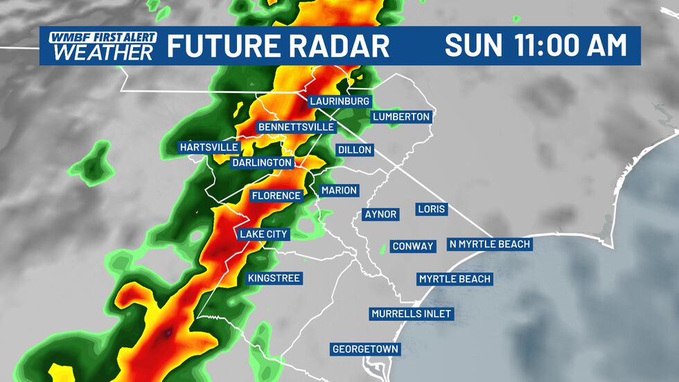Based on new data this morning, the line of storms will start to work through the Pee Dee through the mid-morning and into the afternoon. As this line works through the Pee Dee, this is where the highest threat for severe weather will be today.