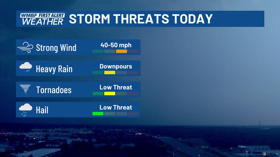 As this line of storms approaches the Grand Strand, the threat for tornadoes will be much lower, however, we will still be watching. The main threat for the Grand Strand today will be wind gusts and heavy downpours. Wind gusts today will be around 40 to 50 mph.