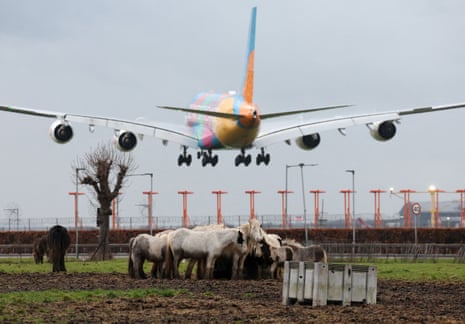 FILE PHOTO: A passenger plane flies over horses feeding as it makes its landing approach to Heathrow Airport in west London, Britain, 28 January, 2025. Photograph: Toby Melville/Reuters