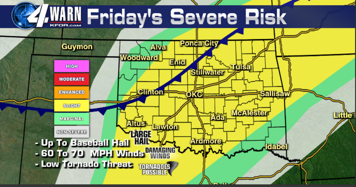 A cold front moves across Oklahoma Friday evening, expect widespread rain and thunderstorms with some severe weather and heavy rainfall.