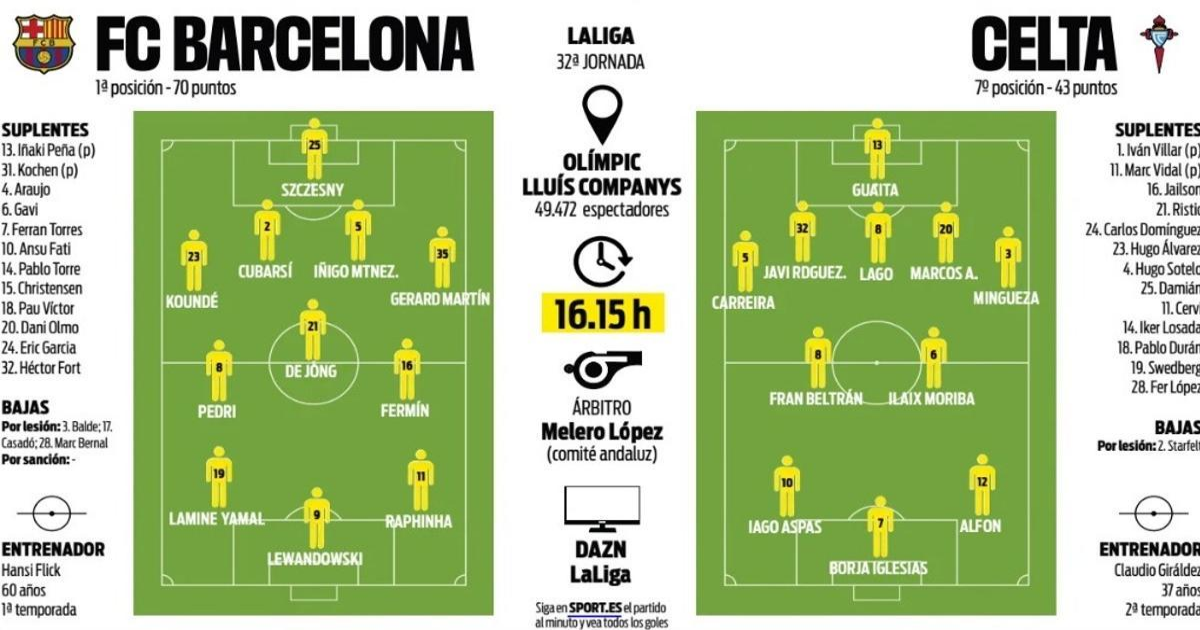 FC Barcelona: Szczesny; Kounde, Cubarsí, Iñigo, Gerard; Pedri, De Jong, Fermín; Lamine, Raphinha y Lewandowski