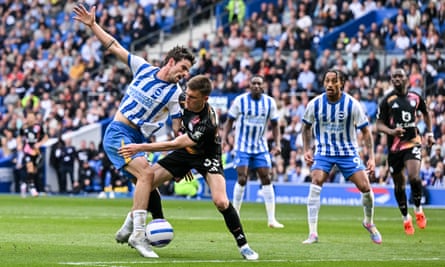 Luke Thomas gets to grips with Brighton’s Matt O’Riley. Photograph: Glyn Kirk/AFP/Getty Images