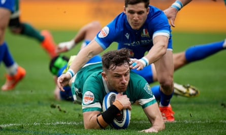 Hugo Keenan touches down. Photograph: Andrew Medichini/AP