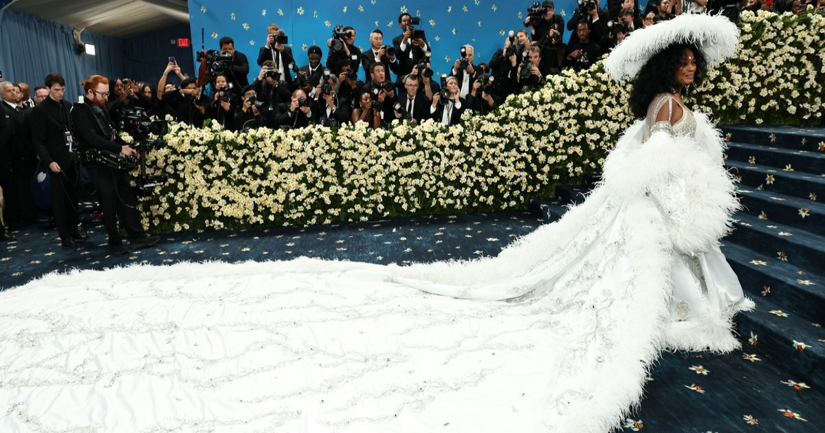 For fashion’s biggest night, the Grammy-winning star wore a floor-grazing white crystal-embellished gown that quite literally took over the navy-blue carpet leading up the stairs of the Metropolitan Museum of Art. The former Supreme completed the jaw-dropping look—which she designed herself—with a matching feather-boa-trimmed cape and a dramatic hat that towered above her signature voluminous curls. She later revealed on the red carpet that the cape was embroidered with the names of all of her children and grandchildren. Multiple handlers had to help the superstar carry her dress up the stairs—but when you’re one of the world’s definitive divas, that’s the least that a couple of men can do!