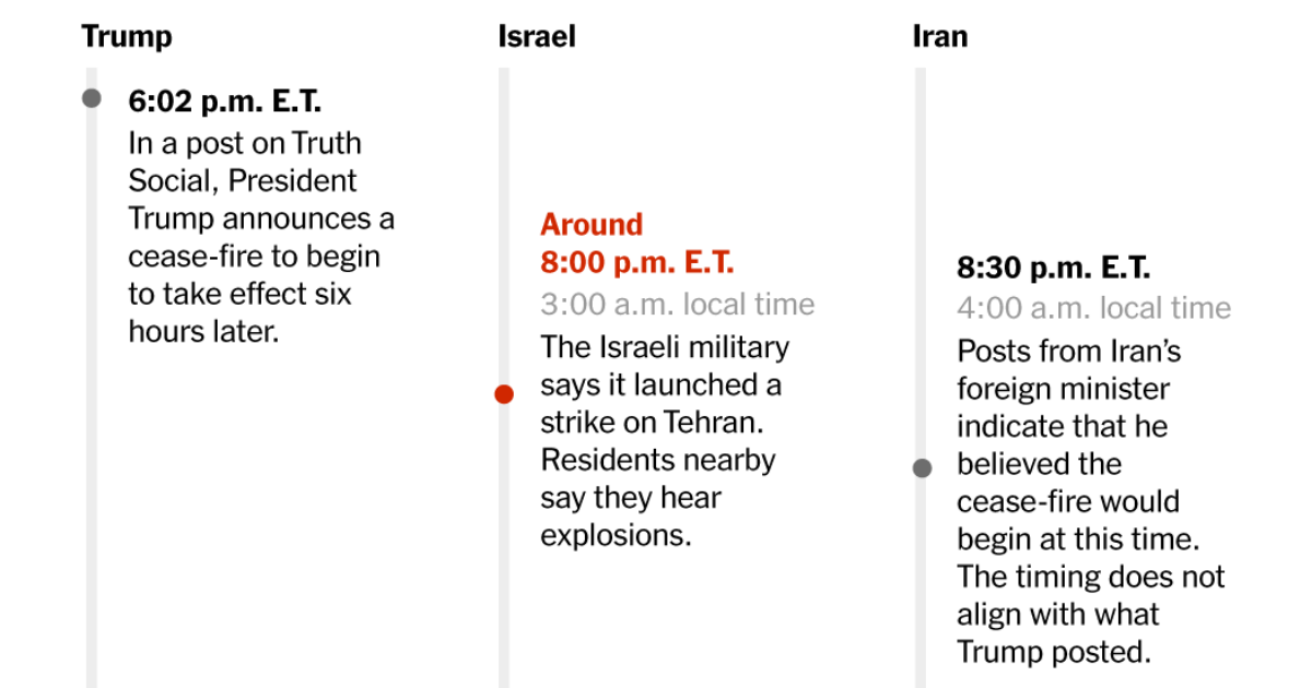 - Posts from Iran’s foreign minister indicate that he believed the cease-fire would begin at this time. The timing does not align with what Trump posted.