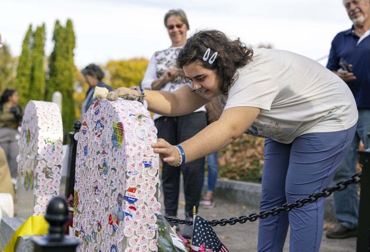 Lydia Mattia, 19, leaving her “I voted” sticker on the headstone of Susan B. Anthony at Mount Hope Cemetery in Rochester, N.Y. on Election Day, Tuesday, Nov. 5, 2024. Lydia Mattia, 19, leaving her “I voted” sticker on the headstone of Susan B. Anthony at Mount Hope Cemetery in Rochester, N.Y. on Election Day, Tuesday, Nov. 5, 2024. Lauren Petracca/AP Photo
